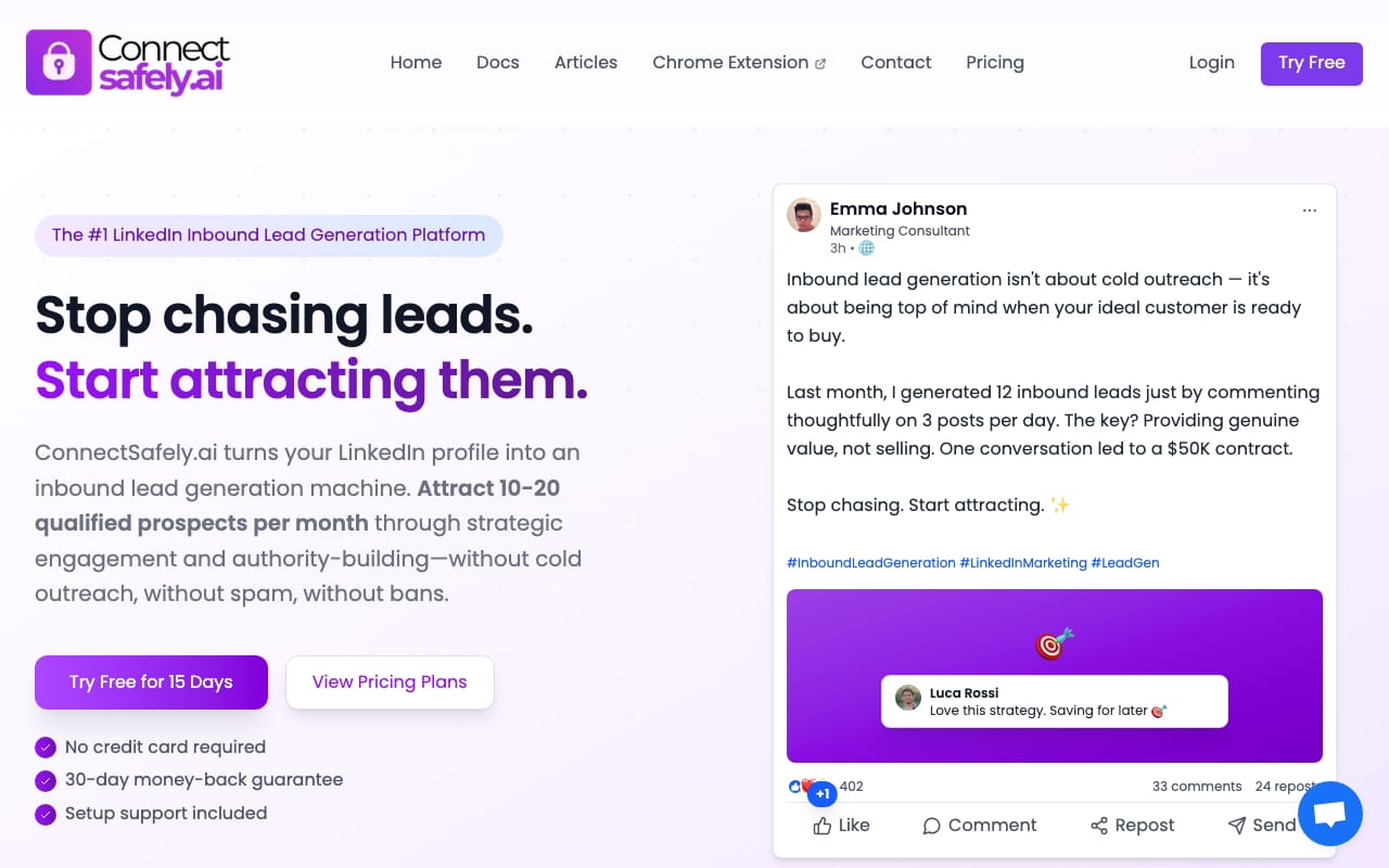 Ready to stop chasing leads and start attracting them? Start your free ConnectSafely.ai trial and experience the power of inbound LinkedIn lead generation.