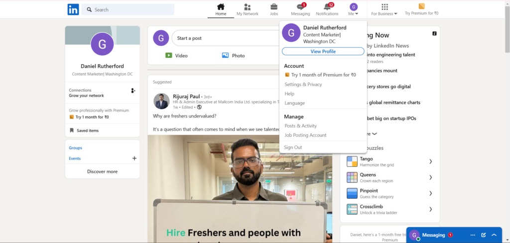 Log in to LinkedIn and click your profile photo or the "Me" icon in the top-right corner of the navigation bar.