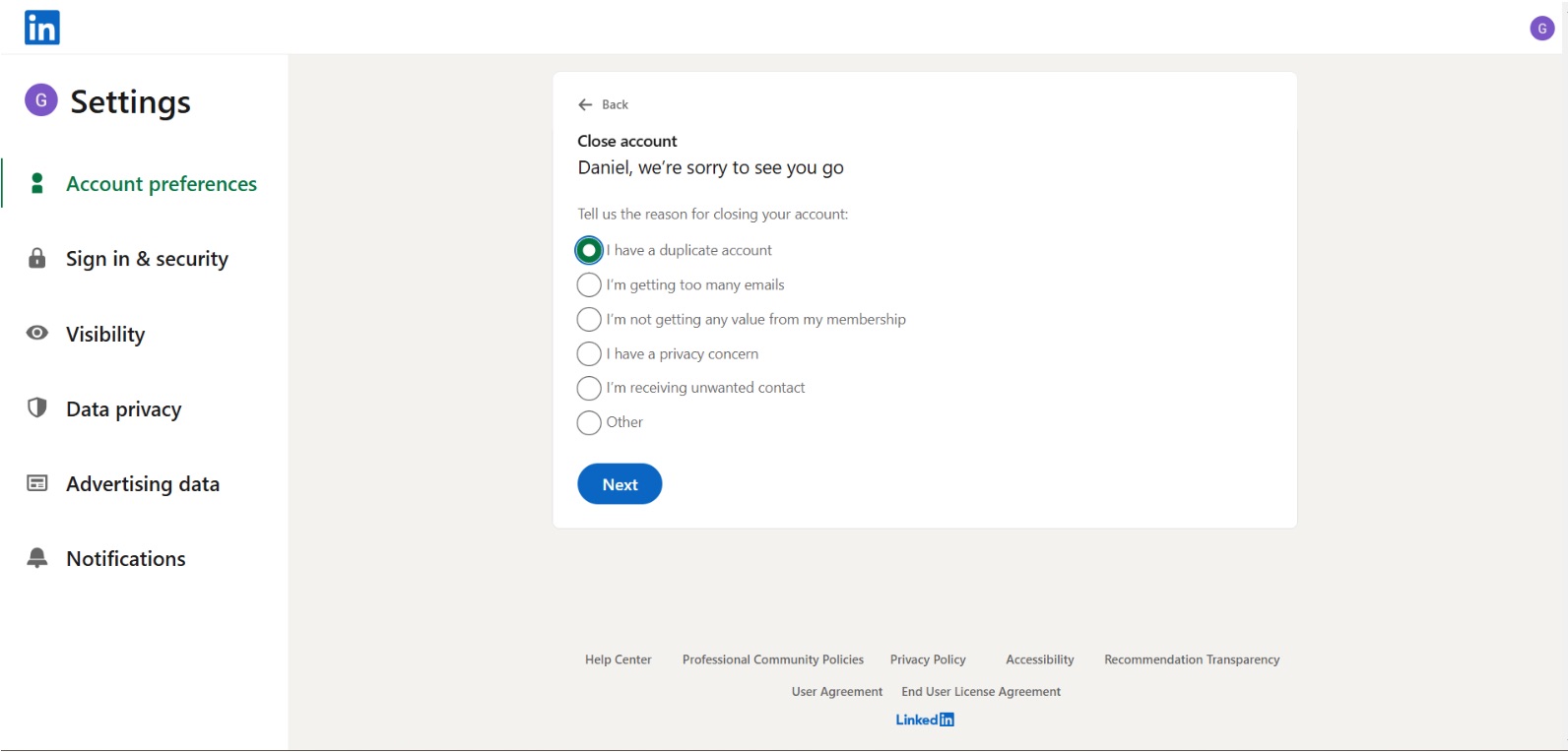 Scroll down and click "Close Account". LinkedIn will ask you to select a reason for leaving.