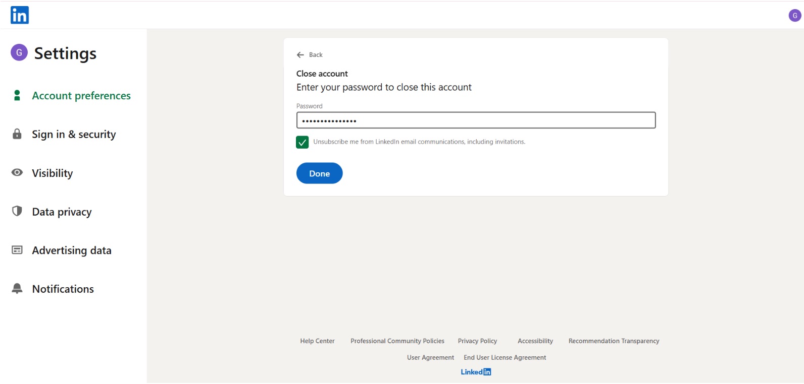 Enter your LinkedIn password to verify your identity, then click "Close Account" to finalize the deletion.