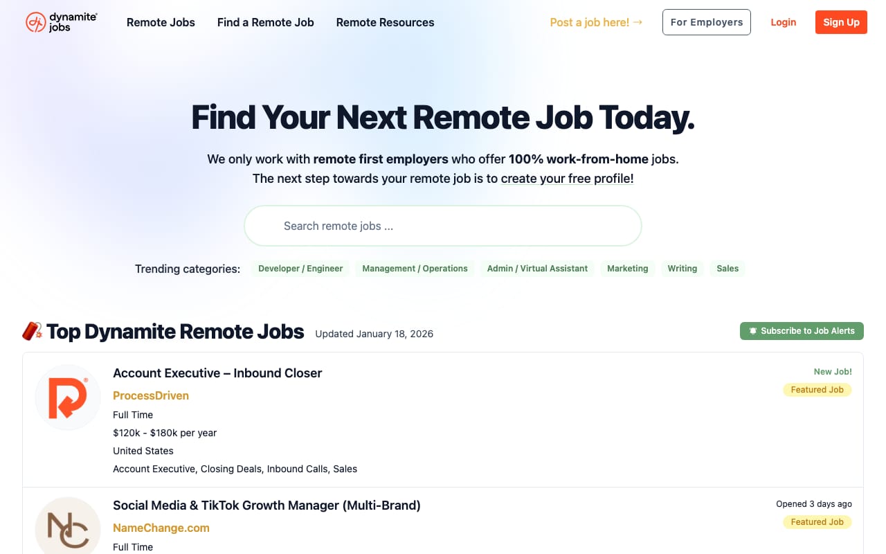 Dynamite Jobs focuses on remote-first employers—companies built around distributed work, not just offering it as a perk. Founded by the Tropical MBA podcast team, it connects job seekers with bootstrapped, profitable companies that prioritize work-life balance. Strong in marketing, operations, and customer success roles.