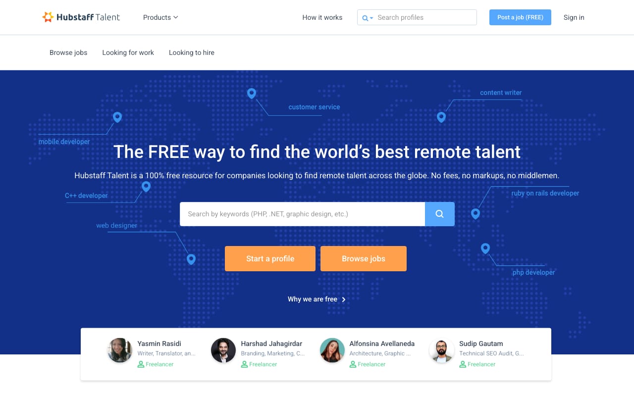 Hubstaff Talent is completely free—no fees for job seekers or employers. The platform connects remote workers with businesses seeking freelancers and full-time employees. Categories span development, design, marketing, virtual assistance, and more.