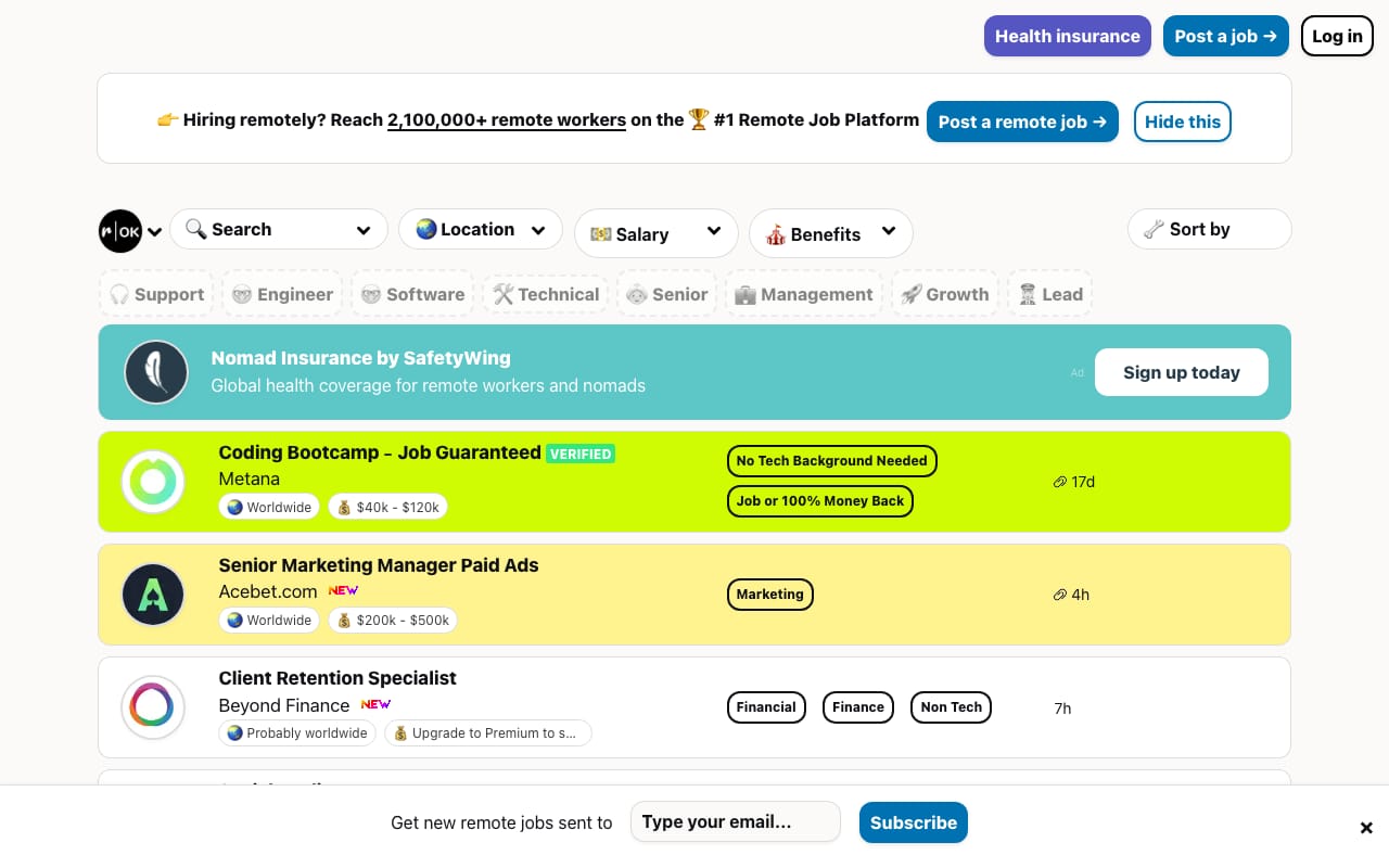 Remotive combines a job board with a community of 30,000+ remote workers. The weekly newsletter delivers curated remote jobs to your inbox, and the Slack community provides networking and advice. Job categories span engineering, product, design, marketing, sales, and support.